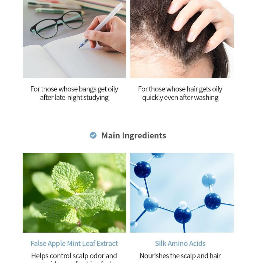 ● Soft fresh care! Anytime anywhere pang pang on bangs and scalp! Quick and easy use for soft care on oily hair.