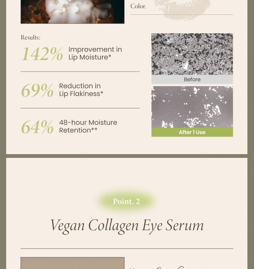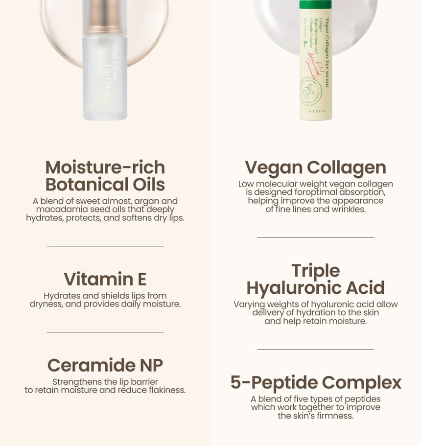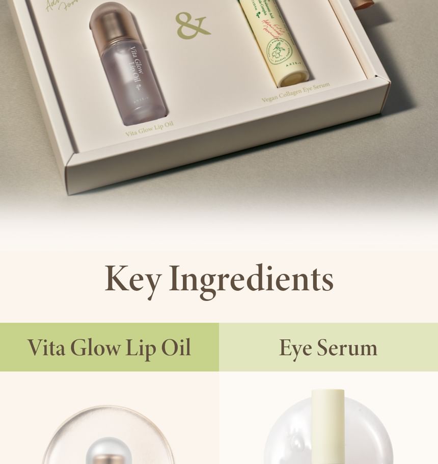 [Eye Serum] Water, Methylpropanediol, Glycerin, 1,2-Hexanediol, Niacinamide, Butylene Glycol, Hydroxyethyl Acrylate/sodium Acryloyldimethyl Taurate Copolymer, C13-14 Alkane, Sodium Acrylic Acid/MA Copolymer, C15-23 Alkane, Ethylhexylglycerin, Collagen, Adenosine, Decyl Glucoside, Prunus Mume Fruit Extract, Limnanthes Alba (Meadowfoam) Seed Oil, Pyrus Malus (Apple) Fruit Extract, Carica Papaya (Papaya) Fruit Extract, Vitis Vinifera (Grape) Fruit Extract, Leuconostoc/Radish Root Ferment Filtrate, Hydrogenated Lecithin, Helianthus Annuus (Sunflower) Seed Oil, Simmondsia Chinensis (Jojoba) Seed Oil, Ulmus Davidiana Root Extract, Amaranthus Caudatus Seed Extract, Ficus Carica (Fig) Fruit Extract, Caprylyl Glycol, Centella Asiatica Extract, Polyglyceryl-10 Stearate, Ceramide NP, Sodium Hyaluronate, Tocopherol, Tripeptide-1, Palmitoyl Pentapeptide-4, Hydrolyzed Hyaluronic Acid, Hexapeptide-9, Copper Tripeptide-1, Acetyl Hexapeptide-8, Sodium Acetylated Hyaluronate [Lip Oil] Polyglyceryl-2 Isostearate/Dimer Dilinoleate Copolymer, Caprylic/Capric Triglyceride, Diisostearyl Malate, Octyldodecanol, Polyglyceryl-2 Triisostearate, Simmondsia Chinensis (Jojoba) Seed Oil, Tocopherol, Glyceryl Caprylate, Ethylhexylglycerin, Prunus Amygdalus Dulcis (Sweet Almond) Oil, Squalane, Macadamia Ternifolia Seed Oil, Ceramide NP, Argania Spinosa Kernel Oil, Olea Europaea (Olive) Fruit Oil, Helianthus Annuus (Sunflower) Seed Oil, Panthenol, Ethylhexyl Palmitate, Trihydroxystearin, Prunus Persica (Peach) Fruit Extract, Sodium Hyaluronate