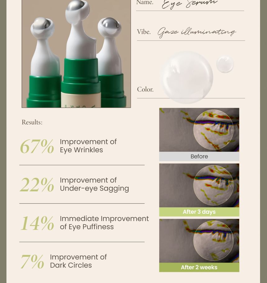 1. Apply a moderate amount of eye serum around the eyes and gently pat to aid absorption.