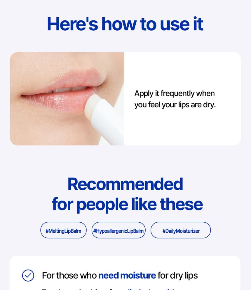3. Soft stick type: A non-greasy, melting moisturizing texture that gently adheres to the lips.