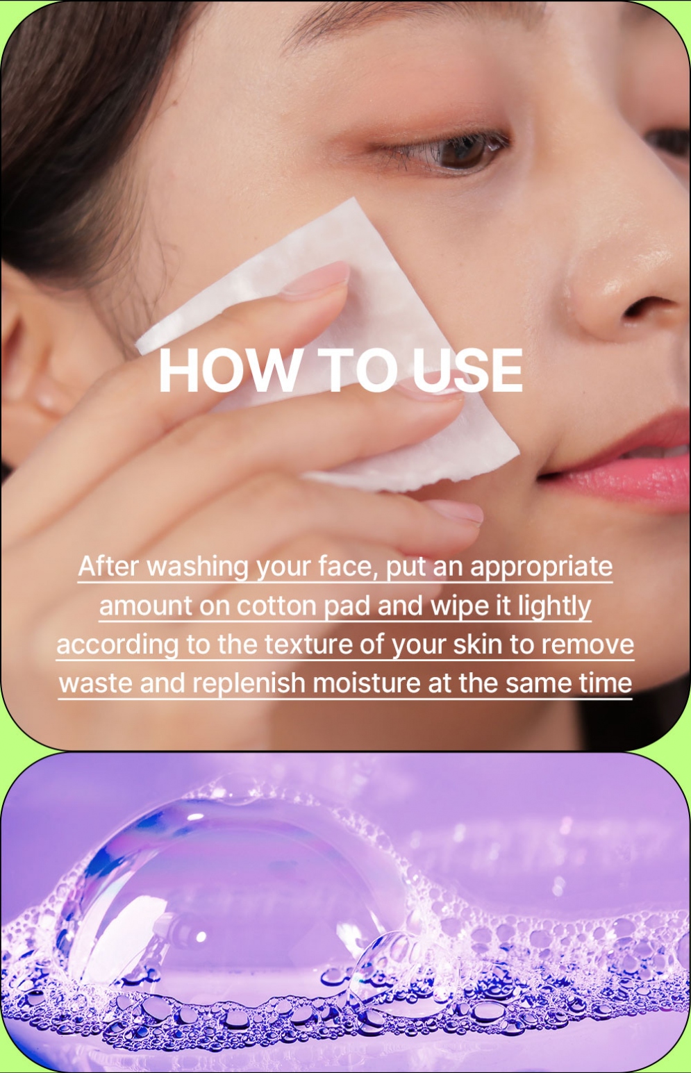 After face cleansing, apply a moderate amount of product on cotton pad, and gently wipe it on your face.